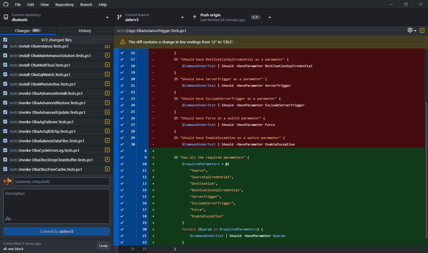 I will say that it's not perfect but it'll get you mostly there. It does mess up when there's just too much data. Like it's struggling with Restore-DbaDatabase.Tests.ps1 because there's over 50 tests in there. So for those one-offs, I'll use 4o which I'm sure is great for one off tasks like this. Though again, not totally complex tasks that require original thought.