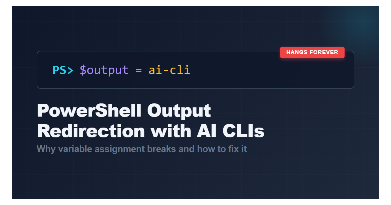 TL;DR: In Windows, many AI CLI tools (Aider, Claude Code, Gemini, etc.) work unreliably with PowerShell's standard output capture. The solution is write to temp files instead of variables or add a -Raw
